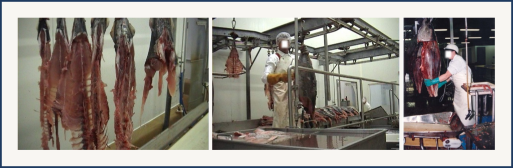 Dans notre usine, on les accrochait par la tête. On avait mis du temps à arriver là. Ce n’était pas une évidence au départ. Alors j’ai regardé travailler les opérateurs. J’ai vu la difficulté. La chair qui restait collée aux arêtes au lieu de se décoller proprement. Les gestes vers le haut, contre la gravité, plus lents et plus fatigants. Et régulièrement, un thon qui se cassait et tombait. Un opérateur supplémentaire pour ramasser, et aussi pour récupérer la chair mal décollée de l’arète.